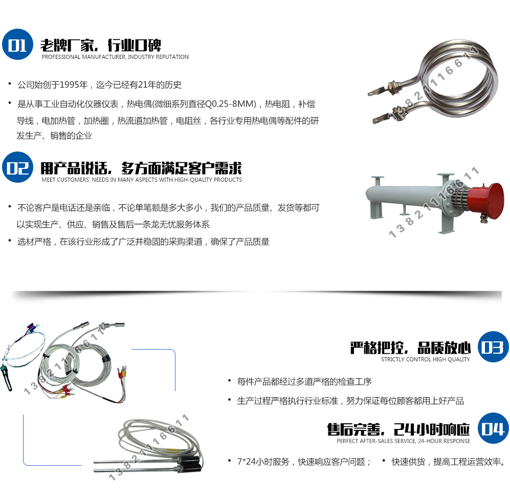 天津昊泰電熱元器件有限公司始創(chuàng)于1995年,迄今已經(jīng)有18年的歷史,是專業(yè)從事工業(yè)自動化儀器儀表,熱電偶(微細(xì)系列直徑Q0.25-8mm),熱電阻,補(bǔ)償導(dǎo)線,電加熱管,加熱圈,熱流道加熱管,電阻絲,各行業(yè)專用熱電偶等配件的研發(fā)、生產(chǎn)、銷售的標(biāo)桿企業(yè)。 我們的產(chǎn)品以“昊泰”為主品牌,可以廣泛用于玻璃、冶金、鋼鐵、石化、水泥,電力,塑料,食品等行業(yè)。產(chǎn)品從選材開始就非常的嚴(yán)格,18年的從業(yè)經(jīng)驗(yàn),我們已經(jīng)在該行業(yè)形成了廣泛并穩(wěn)固的優(yōu)質(zhì)采購渠道,確保了產(chǎn)品質(zhì)量關(guān)。同時(shí),引進(jìn)的國外先進(jìn)的生產(chǎn)及檢驗(yàn)設(shè)備,以及擁有的業(yè)界資深的技術(shù)研發(fā)團(tuán)隊(duì),使得生產(chǎn)流程能夠規(guī)范的按照ISO9001:2000國際質(zhì)量體系標(biāo)準(zhǔn)進(jìn)行,能夠在技藝上精益求精。 天津江蘇商會五金機(jī)電分會副會長,昊泰總經(jīng)理李興旺,一直秉信先做人,再做朋友,再做生意。不論客戶是電話還是親臨,不論單筆額是多大多小,我們的產(chǎn)品質(zhì)量、價(jià)格、發(fā)貨等都可以實(shí)現(xiàn)生產(chǎn)、供應(yīng)、銷售及售...